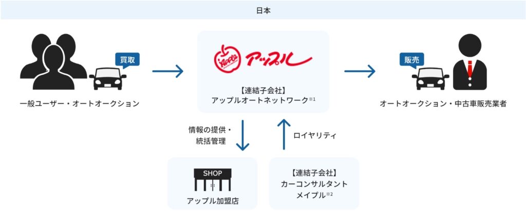東南アジア向け中古車輸出が柱で、国内で中古車買取り専門店「アップル」を展開する、卸売企業です。