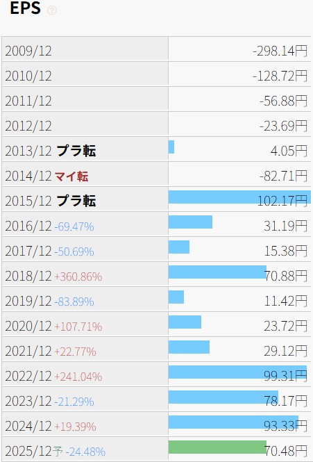 有利子負債比率にも波があり、17年12月期には20.08%まで下がりましたが、25年12月期には82.51%まで増加しています。