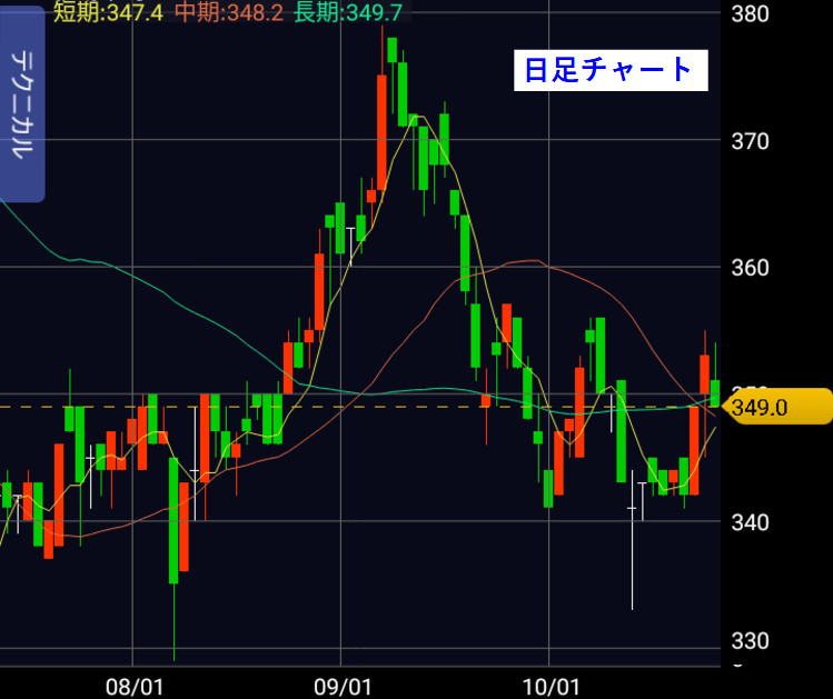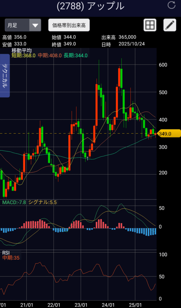 現在の発行済株式総数換算で、上場来高値は2004年の9,660、安値は2011年の52となっています。月足で見ても上下動を繰り返しており、現時点の349はチャート面では底値のようにも思えますが、今の日本株の地合いでこの銘柄を選ぶには決め手に欠けるように感じます。