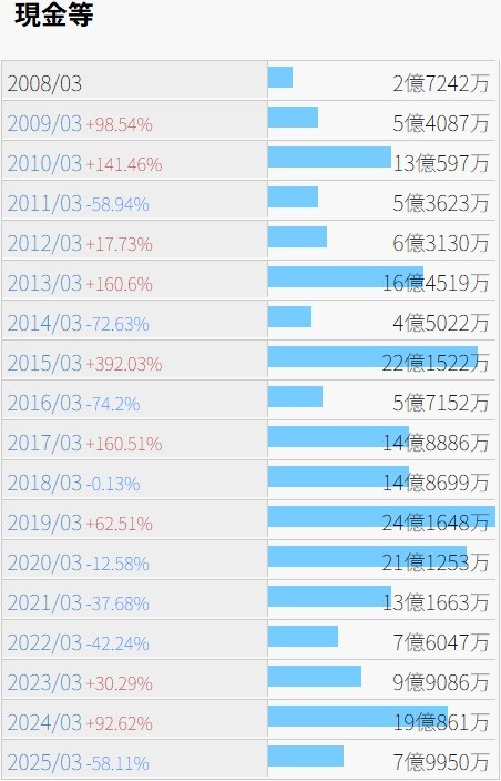 今まで見た銘柄の中では自己資本比率の変動が大きく、45%から61%の間を行き来し、25年3月期は59%となっています。有利子負債比率もまちまちで、55.55%から17.91%の間で推移しています。