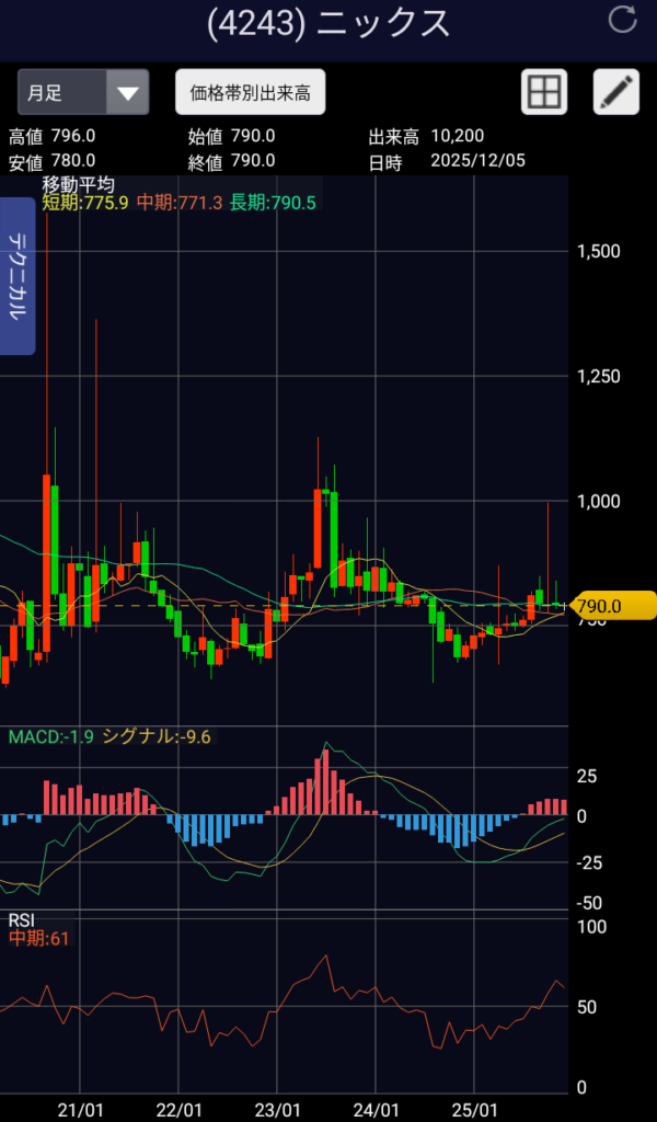 4243 ニックス を取り上げます。2025年12月7日(日)時点のネットキャッシュ比率(投資有価証券は考慮しない)は1.29です。