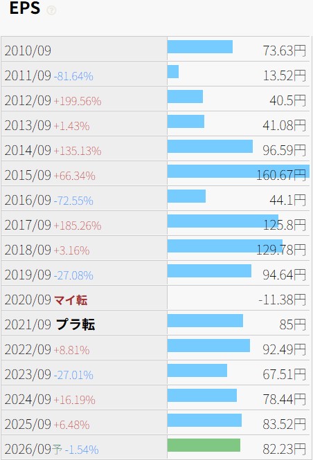 12/7(日)時点の予想年間配当利回りは2.53%。保有するにはほかの動機も必要になりそうです。10年9月期以降、増配が6期、維持が3期、減配が6期。22年9月期以降は維持が続いています。