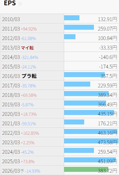 売上高同様、EPSも直近5年程は450~480円近辺に上限を感じる推移です。