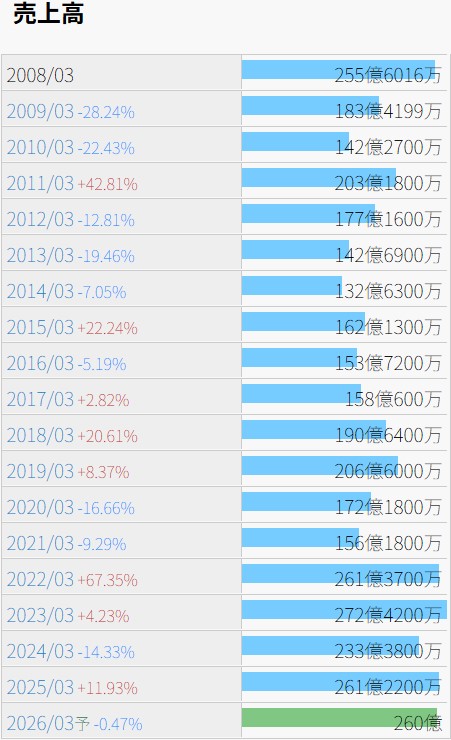 ここ5年程、売上高は260~270億円近辺で蓋をされています。