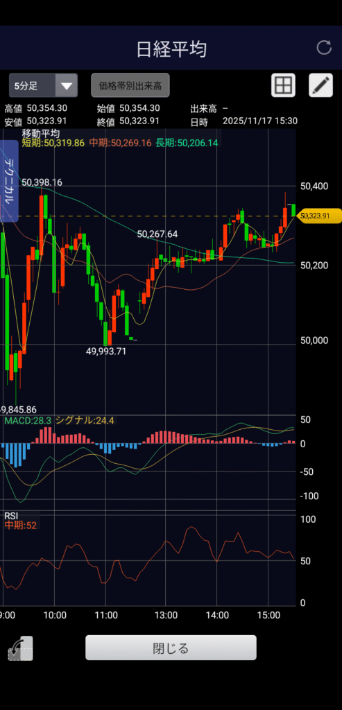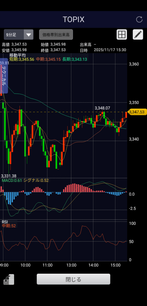 【インバウンド関連下落】2025年11月17日(月)の株価推移(5分足チャート)と市況