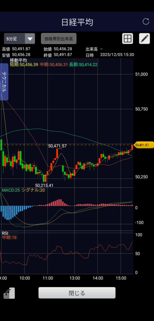 ・日経平均 50,491.87 前日比-536.55(-1.05%)