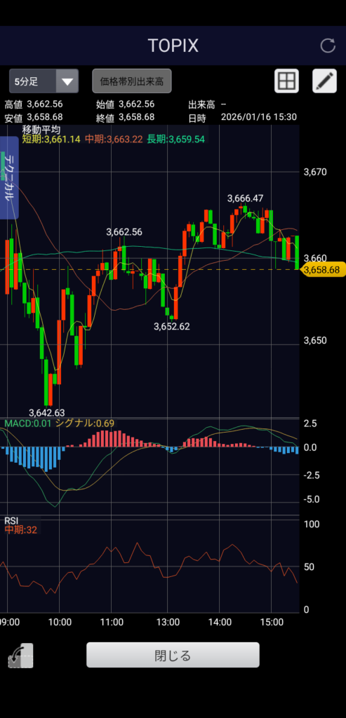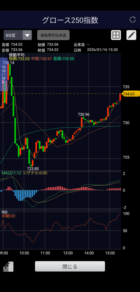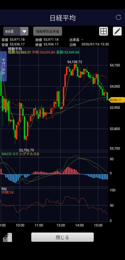 【離合集散】2026年1月16日(金)の株価推移(5分足チャート)と市況