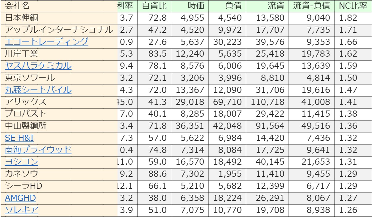 ネットキャッシュ比率(投資有価証券は考慮しない)が1以上の銘柄リストを更新しました。