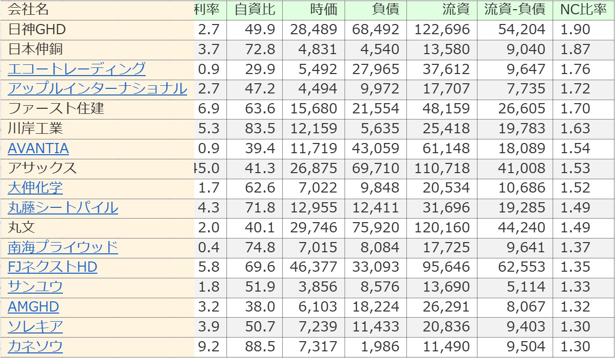 ネットキャッシュ比率(投資有価証券は考慮しない)が1以上の銘柄リストを更新しました。