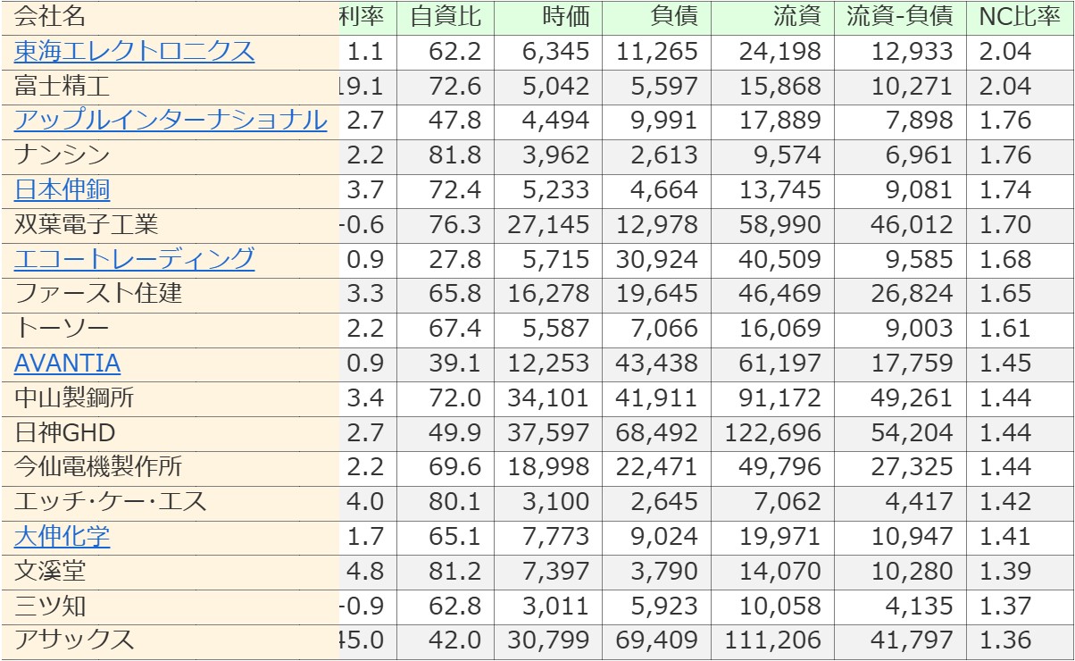 ネットキャッシュ比率(投資有価証券は考慮しない)が1以上の銘柄リストを更新しました。
